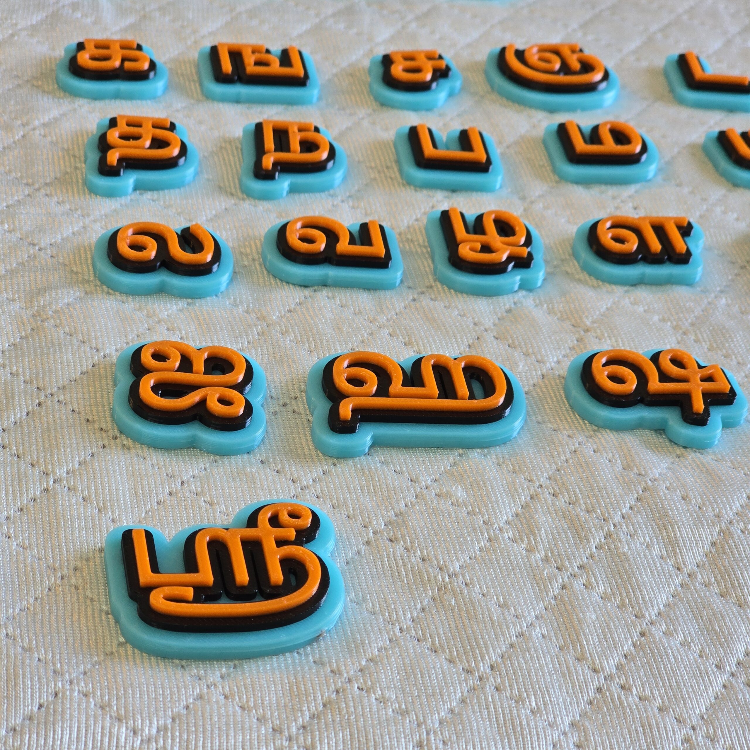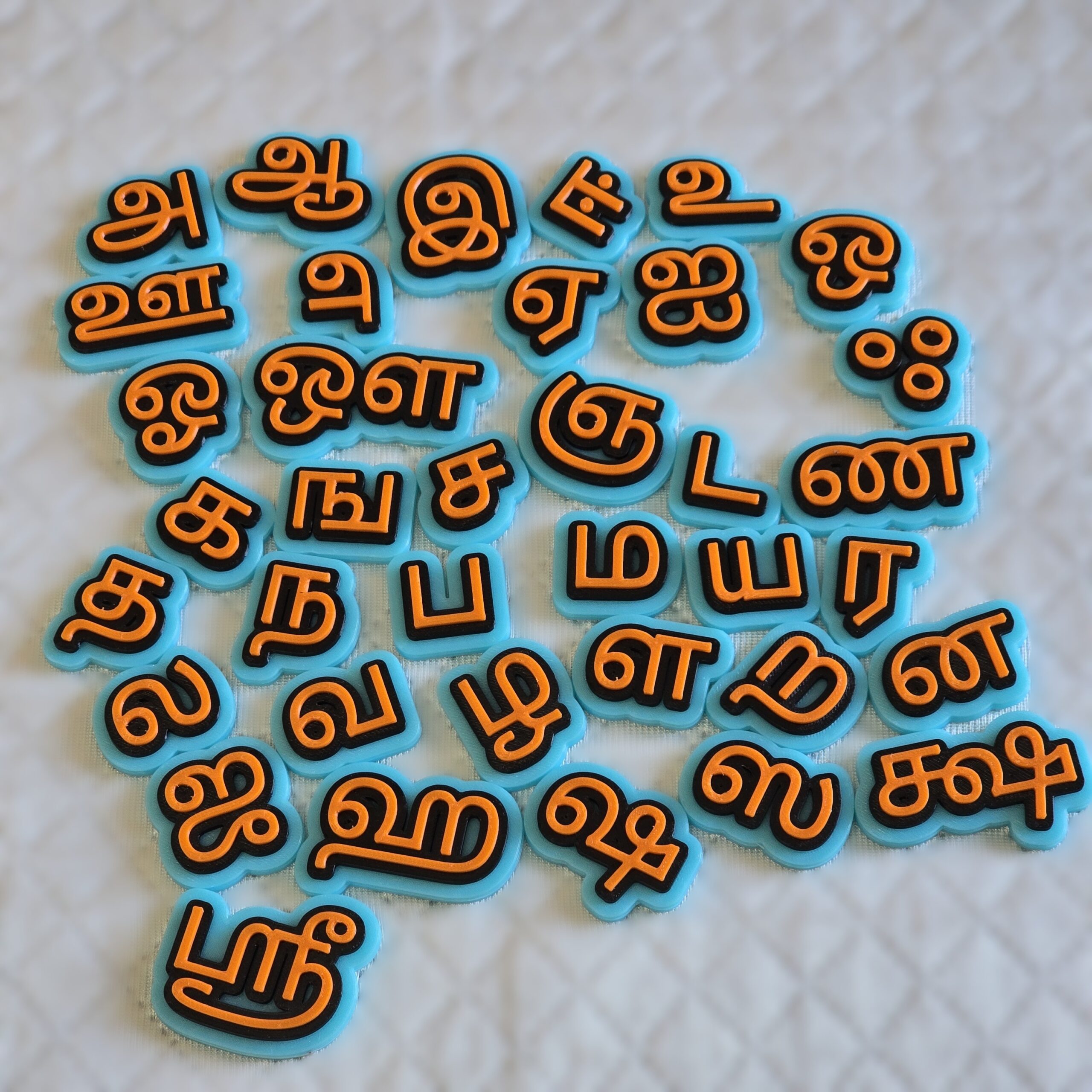 13 Tamil Uyir vowels (உயிர் எழுத்துக்கள்) and 24 Tamil Mei consonants (மெய் எழுத்துக்கள்) Ezhuthukkal Letters from Telugu Alphabets, right from a, Aa, i, ee and Ka na to cover all the vargam of Thamil varnmala. Created in contrasting colours, and good quality recylable plastic, these are intended to help kids aged 3 years and above to learn and recognize Tamil language writing script.